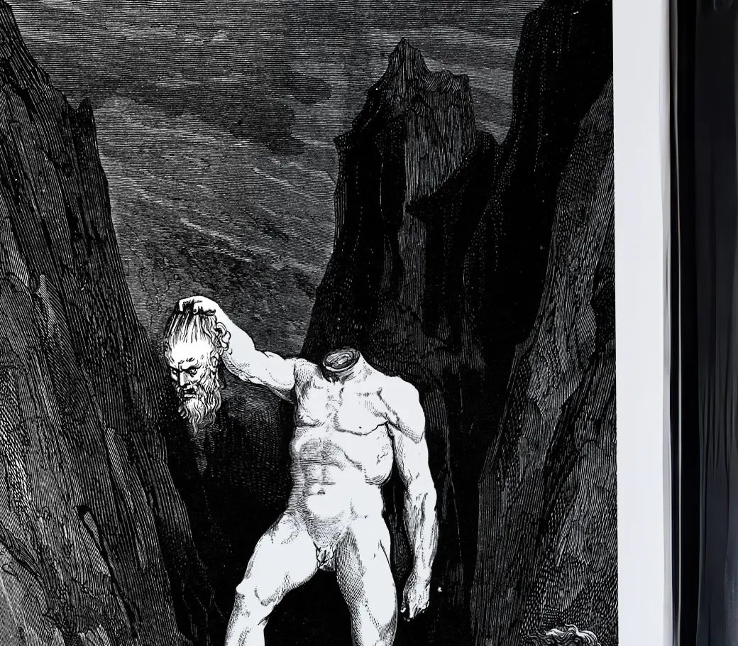 On y voit Bertrand de Born, poète et seigneur, puni pour avoir semé la discorde : il avance dans les ténèbres, portant sa tête tranchée comme une lanterne.