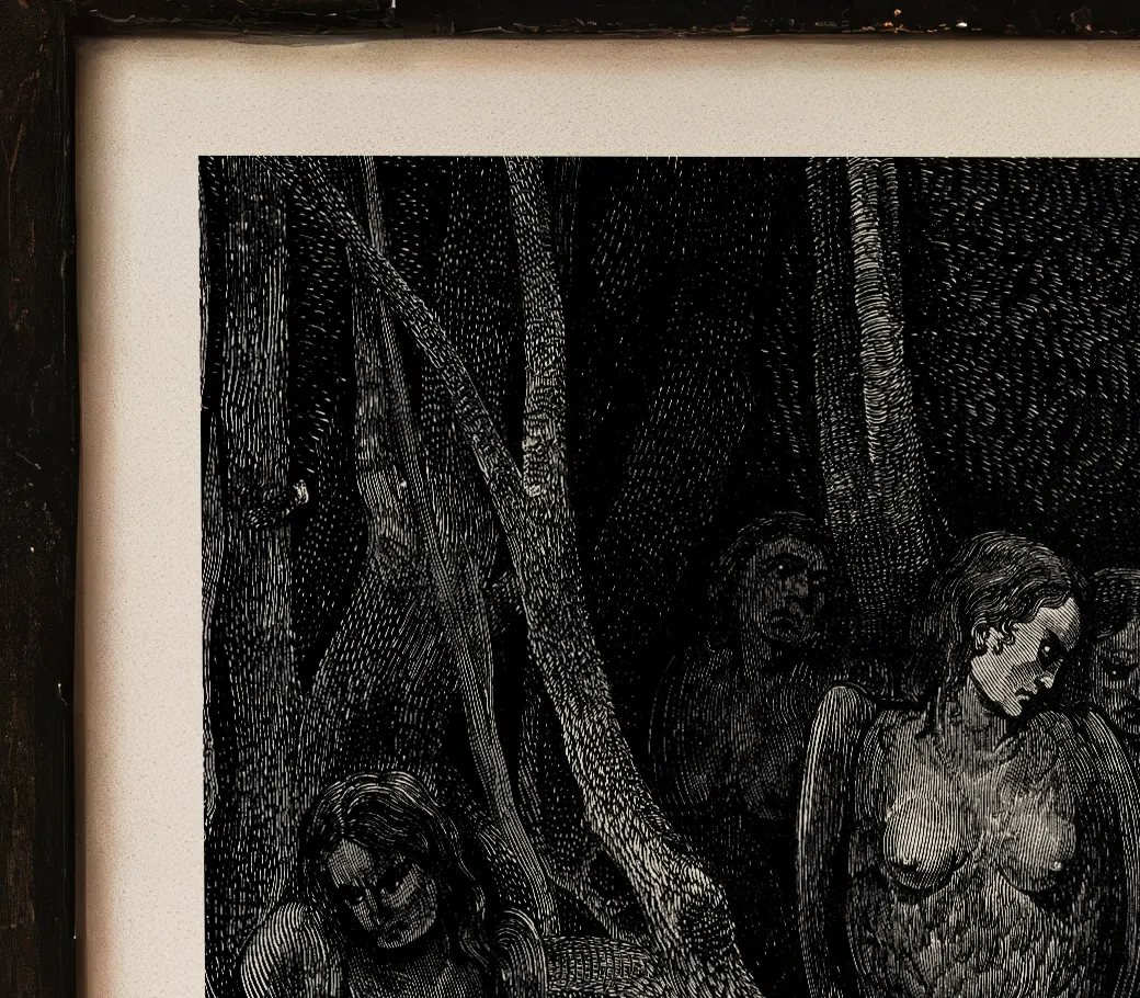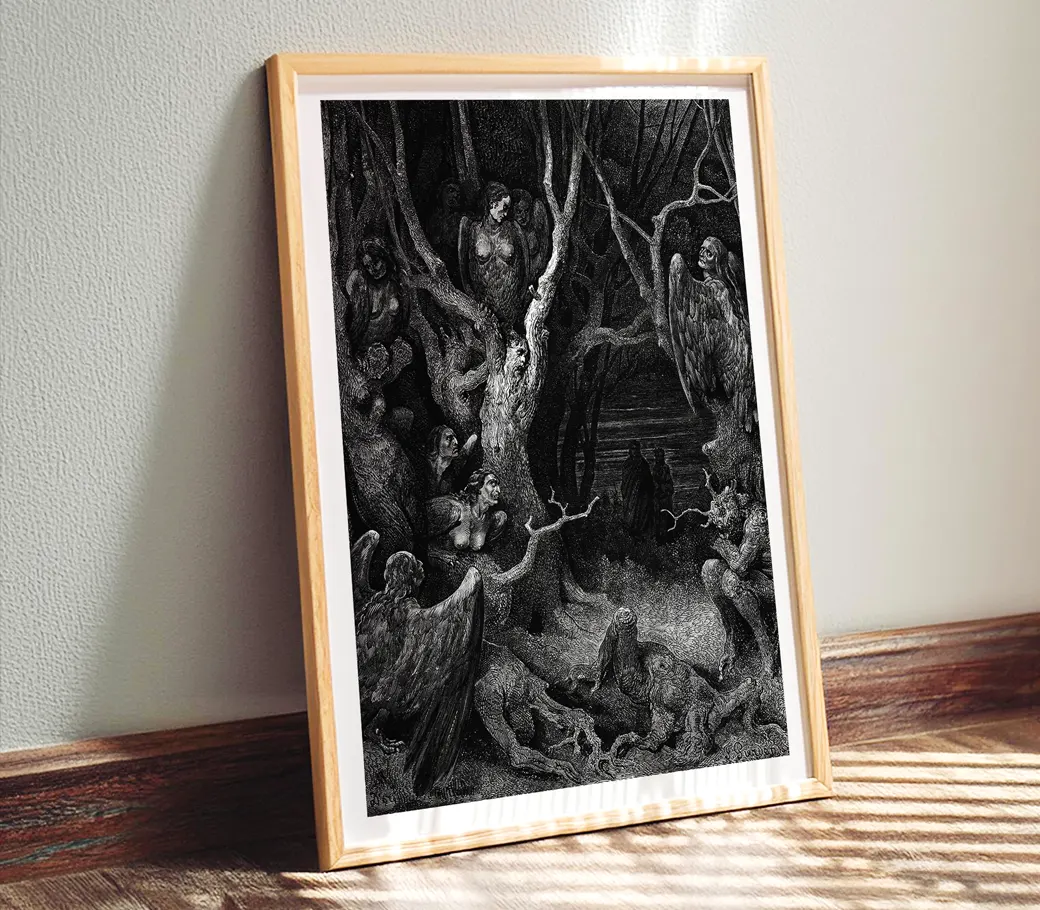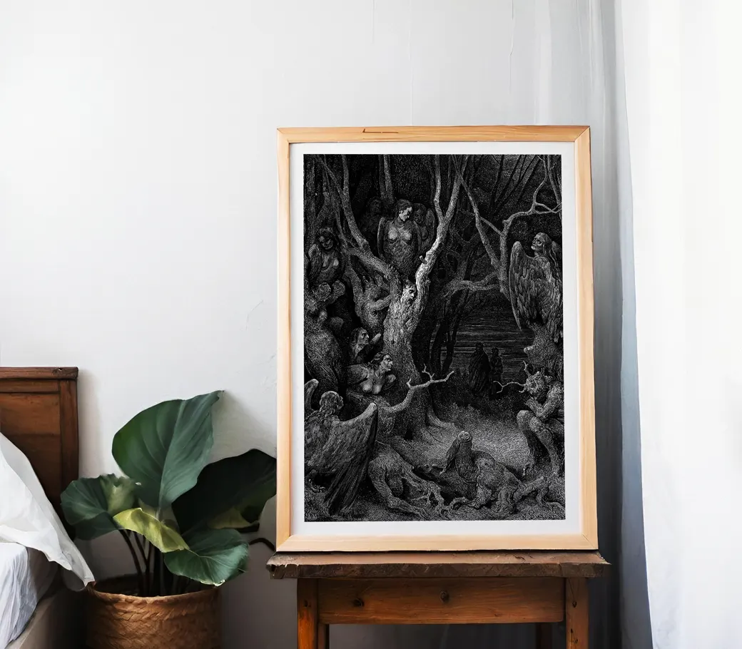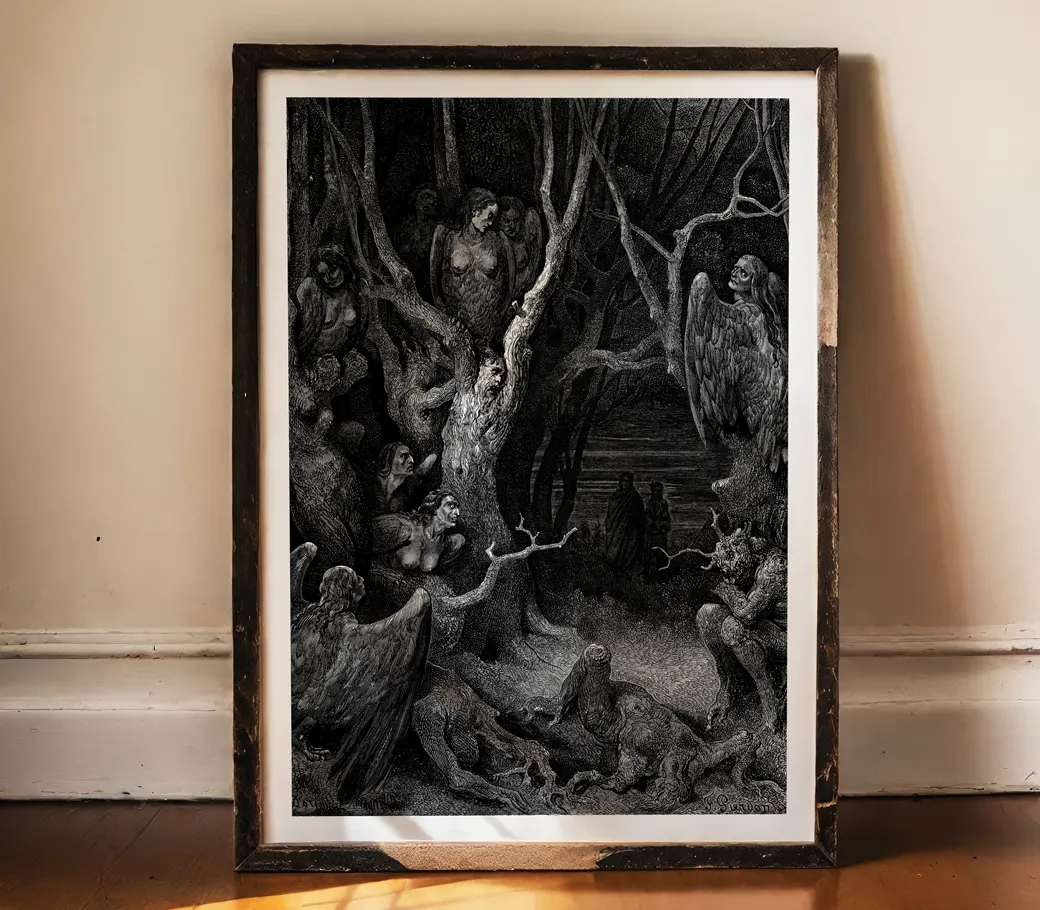Dans cette scène sombre et symbolique, Dante découvre la forêt des suicidés, où les âmes damnées se tordent dans les troncs noueux des arbres, prisonnières de leur désespoir éternel.