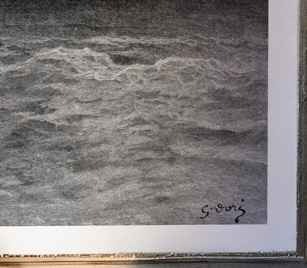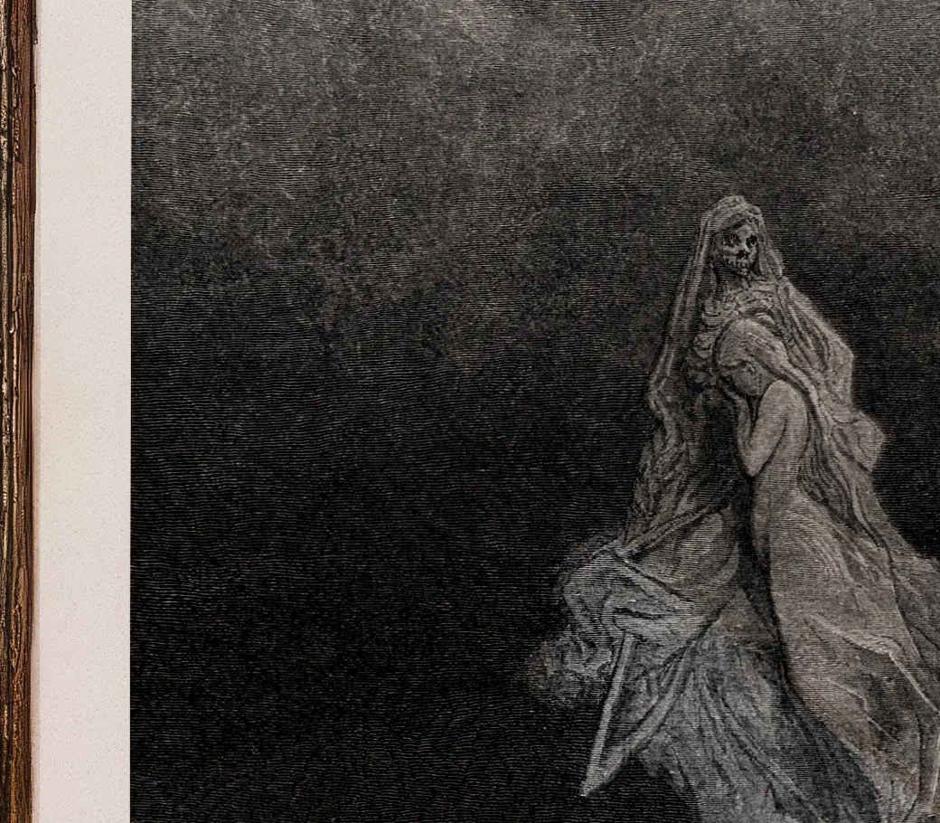 Dans cette vision spectrale, la Mort enlace Lenore et l’emporte loin des vivants, suspendue dans un ciel nocturne balayé par le vent. Doré y déploie tout son romantisme noir : silhouettes décharnées, mouvement dramatique et clair-obscur tourmenté, où la poésie de Poe devient image et mythe.