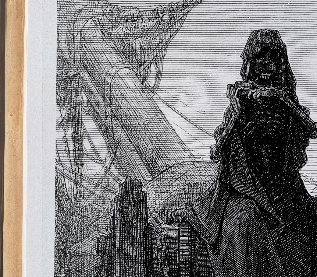 Doré mêle tragédie, tension mystique et clair-obscur gothique dans une scène où le destin prend la forme d’un jeu cruel et divin.